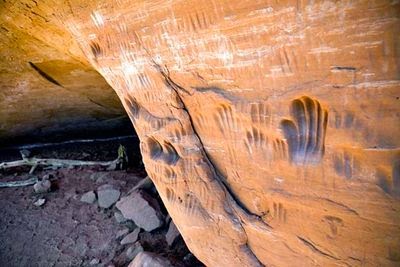 Oto bardzo ciekawa pozostałość starożytnej technologii zmiękczania skały. Znajduje się ona w parku stanowym Kodachrome Basin, w USA. Kto i kiedy zrobił takie ślady pozostanie prawdopodobnie na zawsze nieodkrytą tajemnicą, jednak to, że jest to oryginalna skała w której ktoś "zanurzył" ręce nie ulega wątpliwości. Jakim sposobem zmiękczano skałę ? Kiedy to się działo ? Czy była to technologia cząstek atomowych czy może chemicznej substancji pozostaje nieodgadnione.